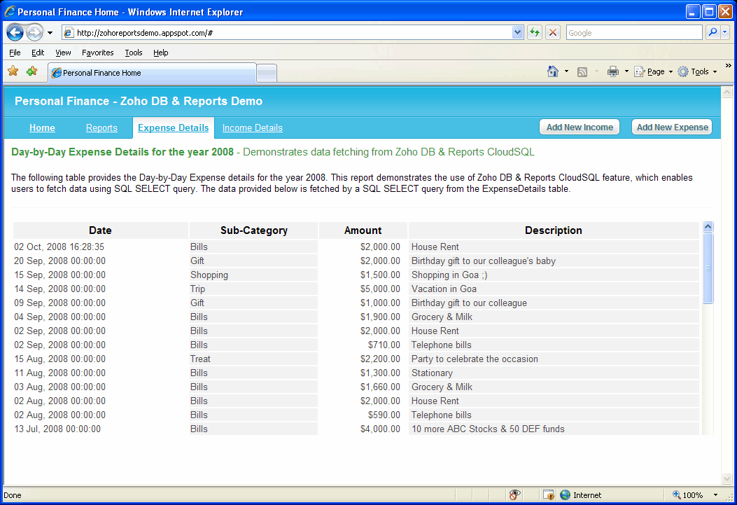 The data provided in this report is fetched from the ExpenseDetails table by our Python code using Zoho Reports CloudSQL API. Zoho CloudSQL is a platform API service that enables developers to use Standard SQL (Structured Query Language) querying over the Web, to access and manipulate data that is available in Zoho.